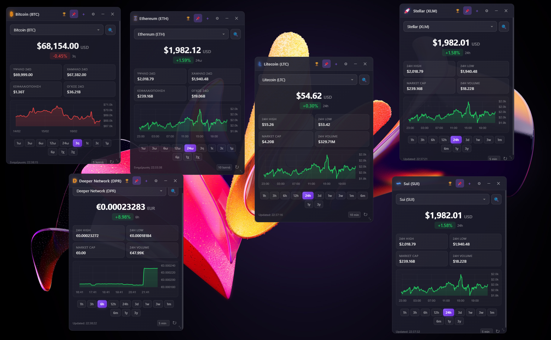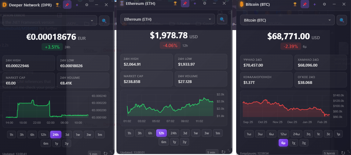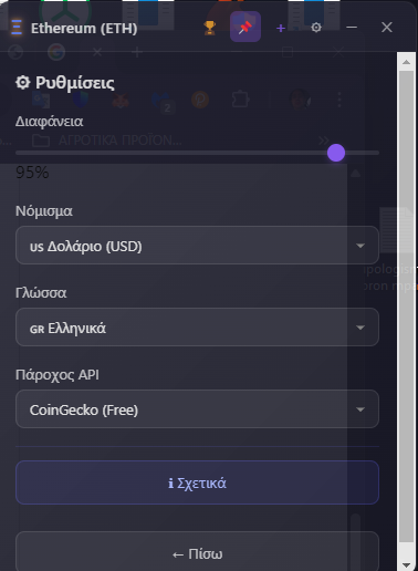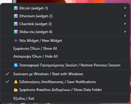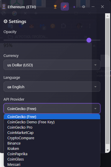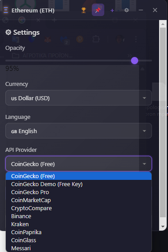 The user can open as many windows as he wants, it has English/Greek. Selection of information refresh time and API Providers list. Also,Top 50 crypto list.